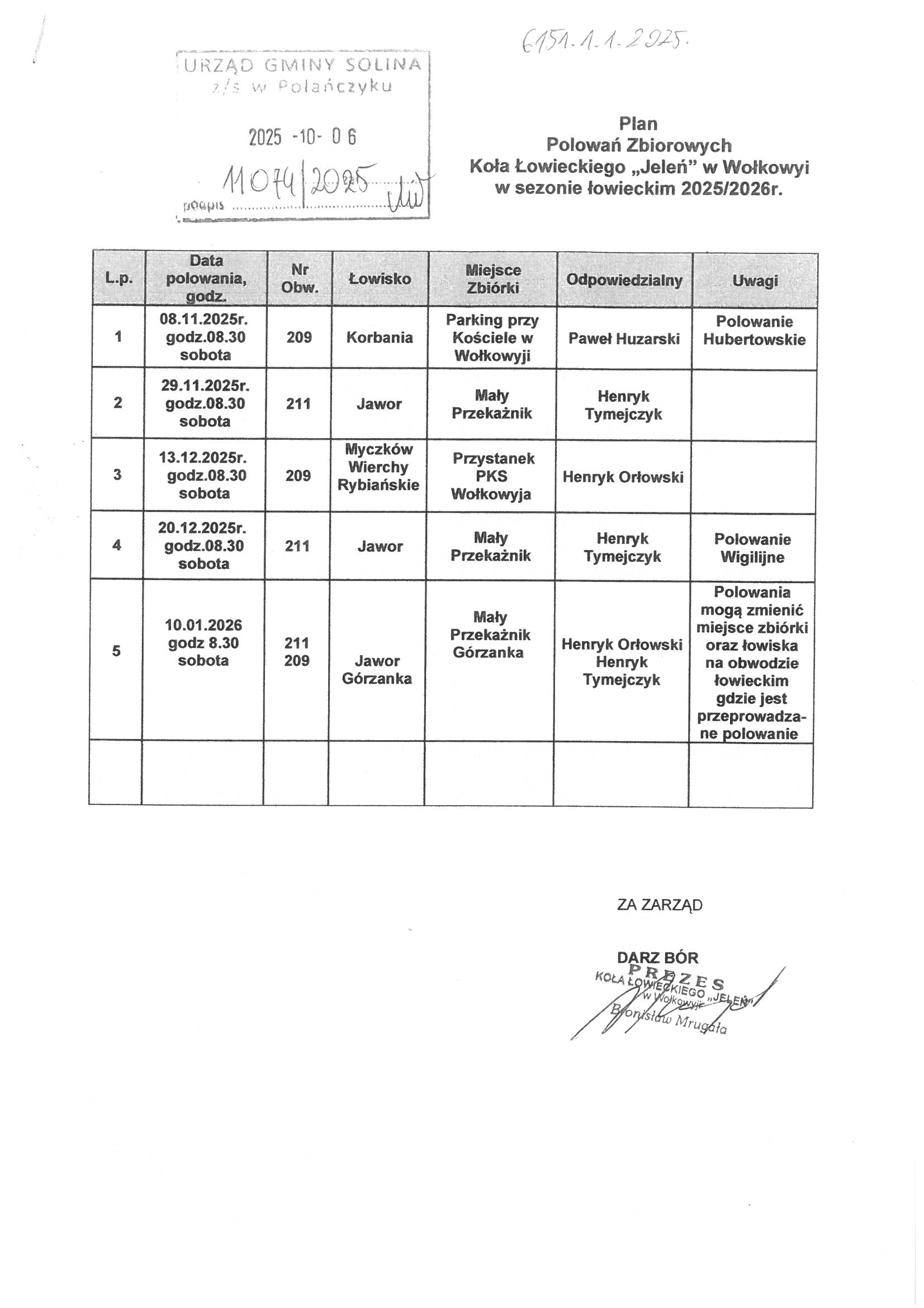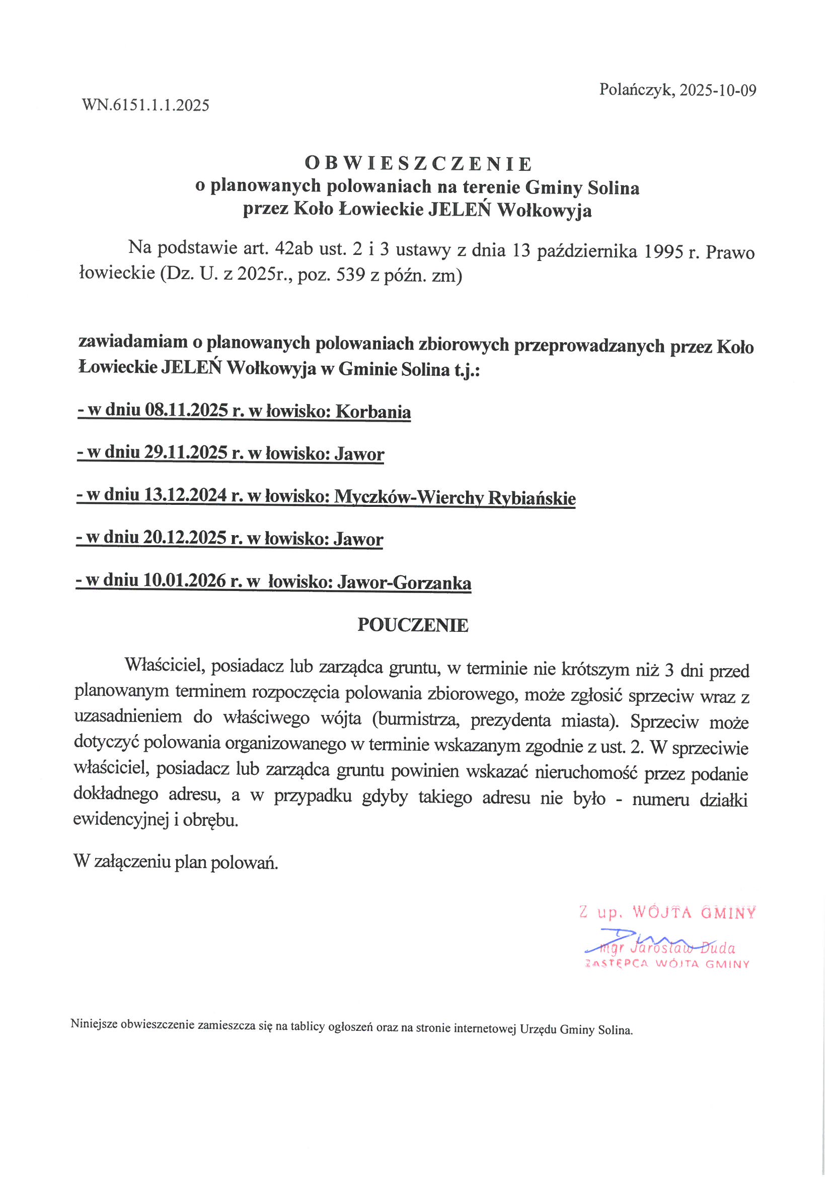 o planowanych polowaniach na terenie Gminy Solina przez Koło Łowieckie JELEŃ Wołkowyja