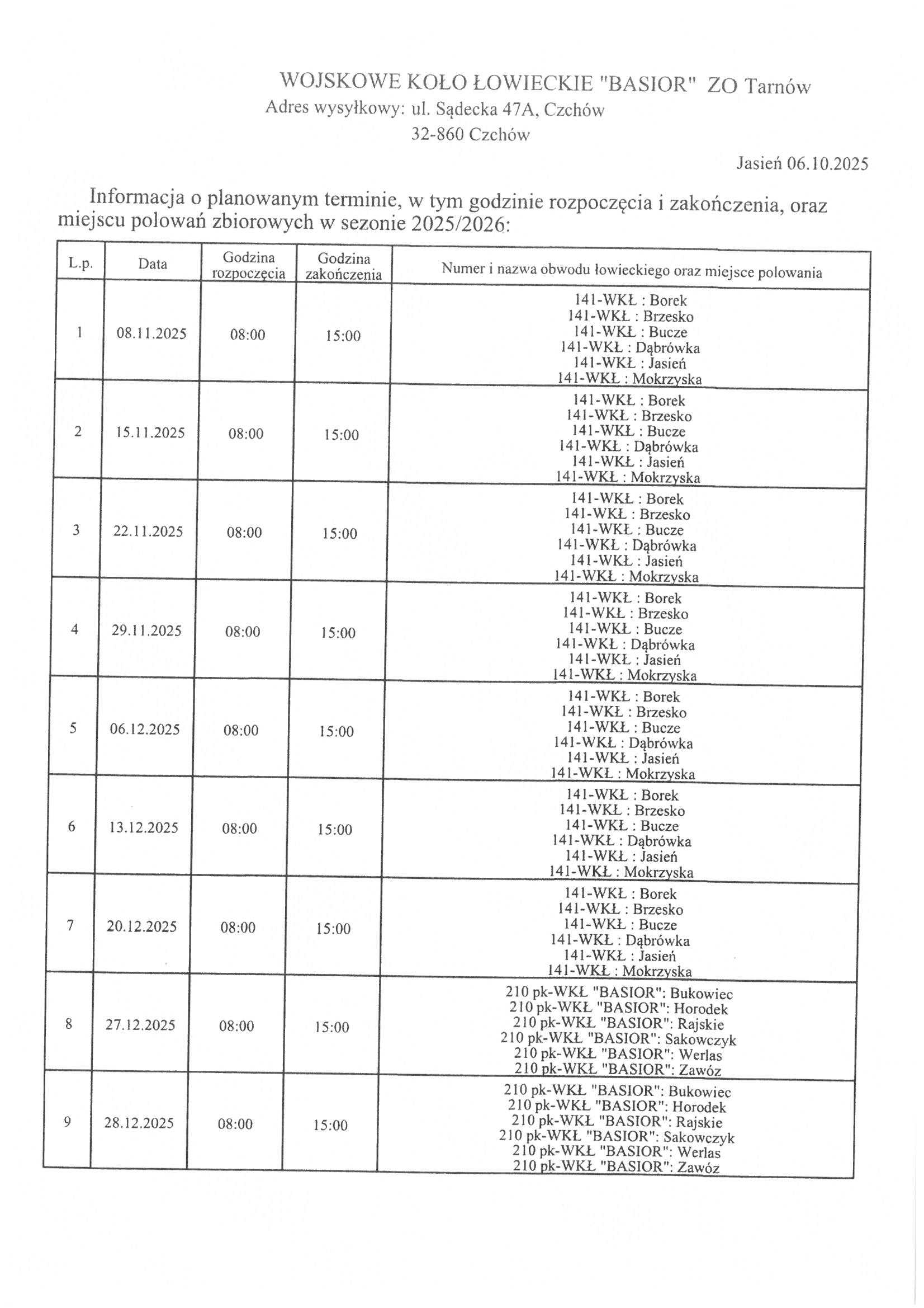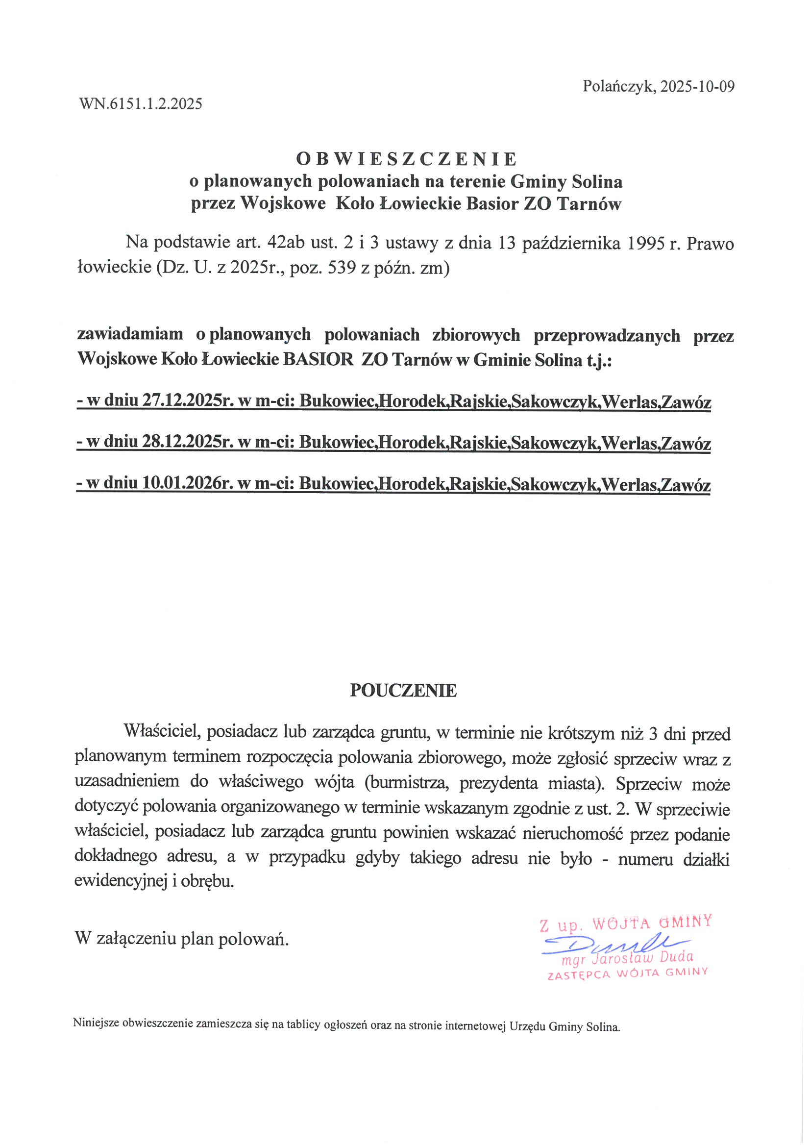o planowanych polowaniach na terenie Gminy Solina przez Wojskowe Koło Łowieckie Basior ZO Tarnów
