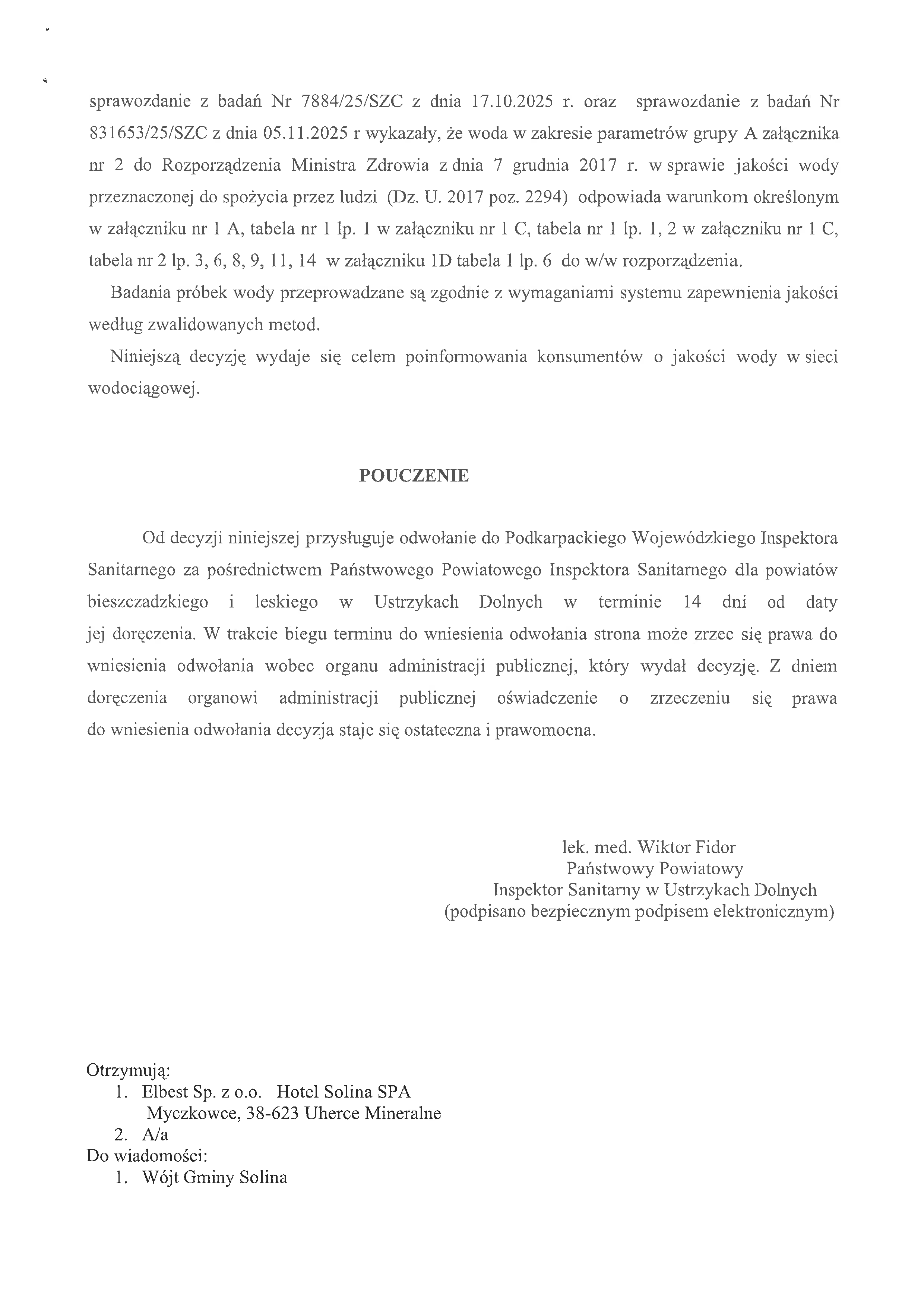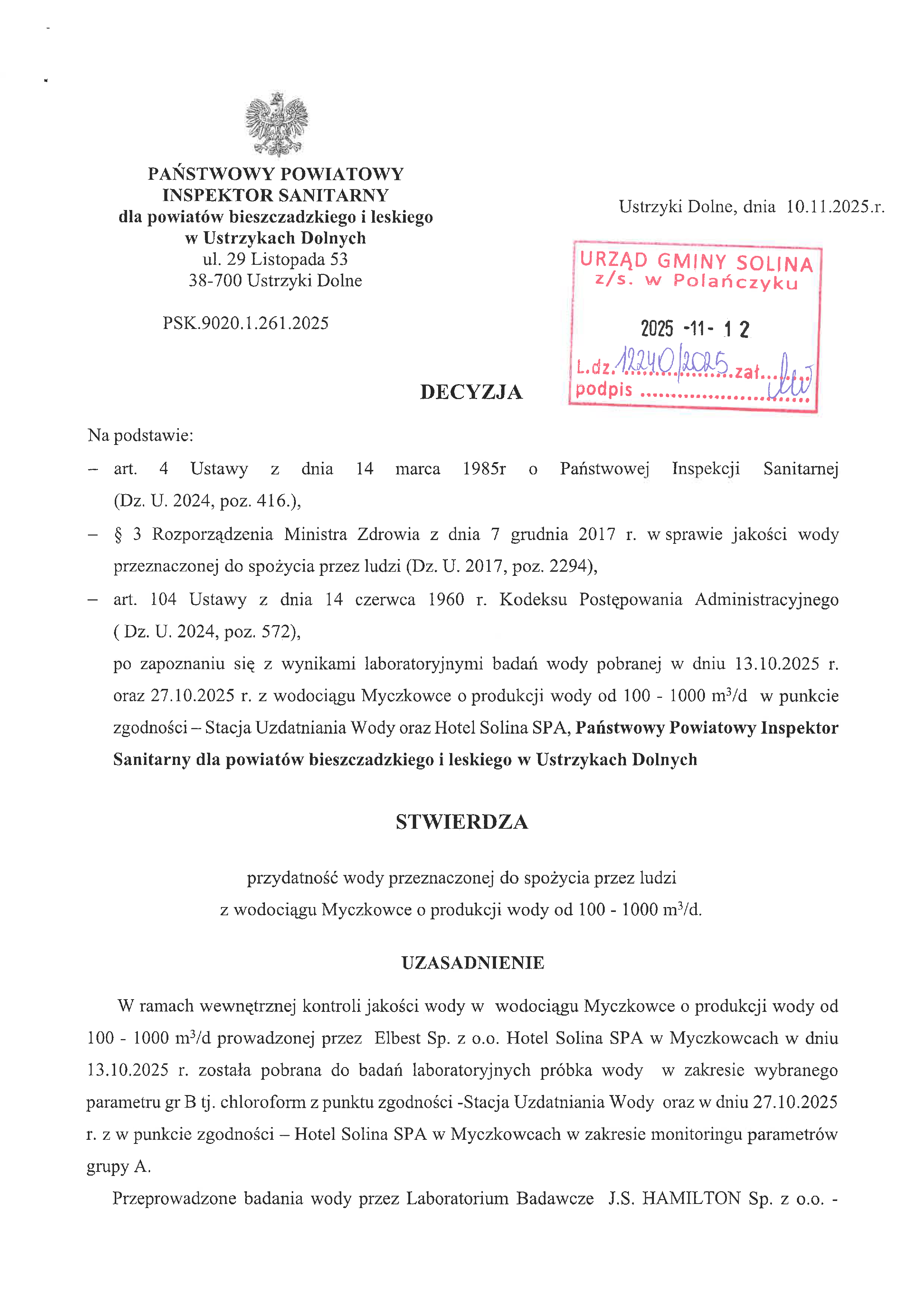 stwierdzająca przydatność wody przeznaczonej do spożycia przez ludzi z wodociągu Myczkowce