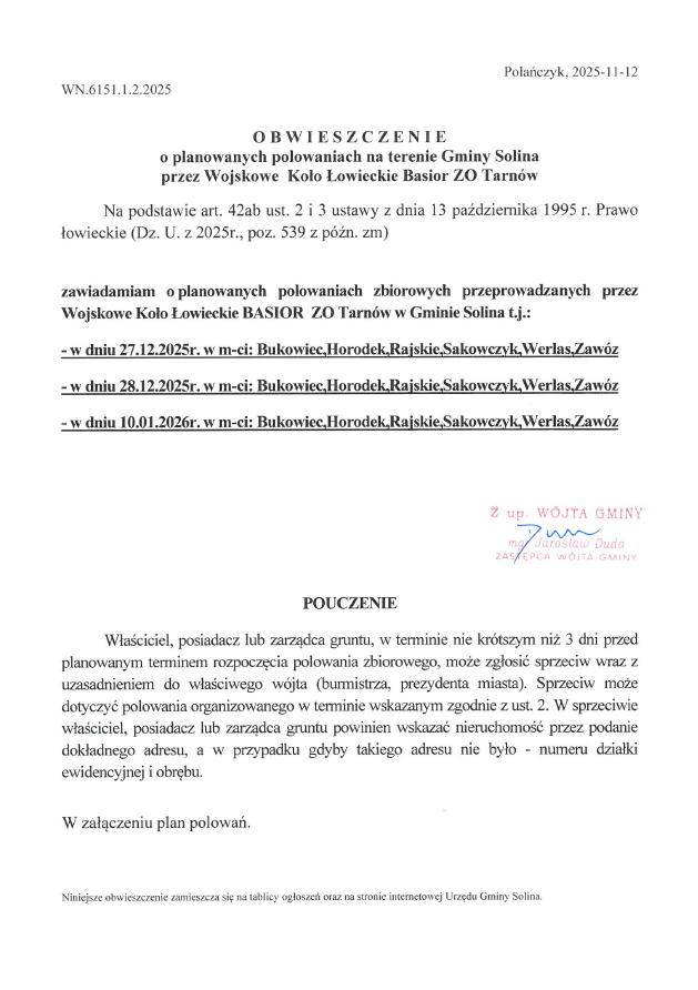 o planowanych polowaniach na terenie Gminy Solina przez Wojskowe Koło Łowieckie Basior ZO Tarnów