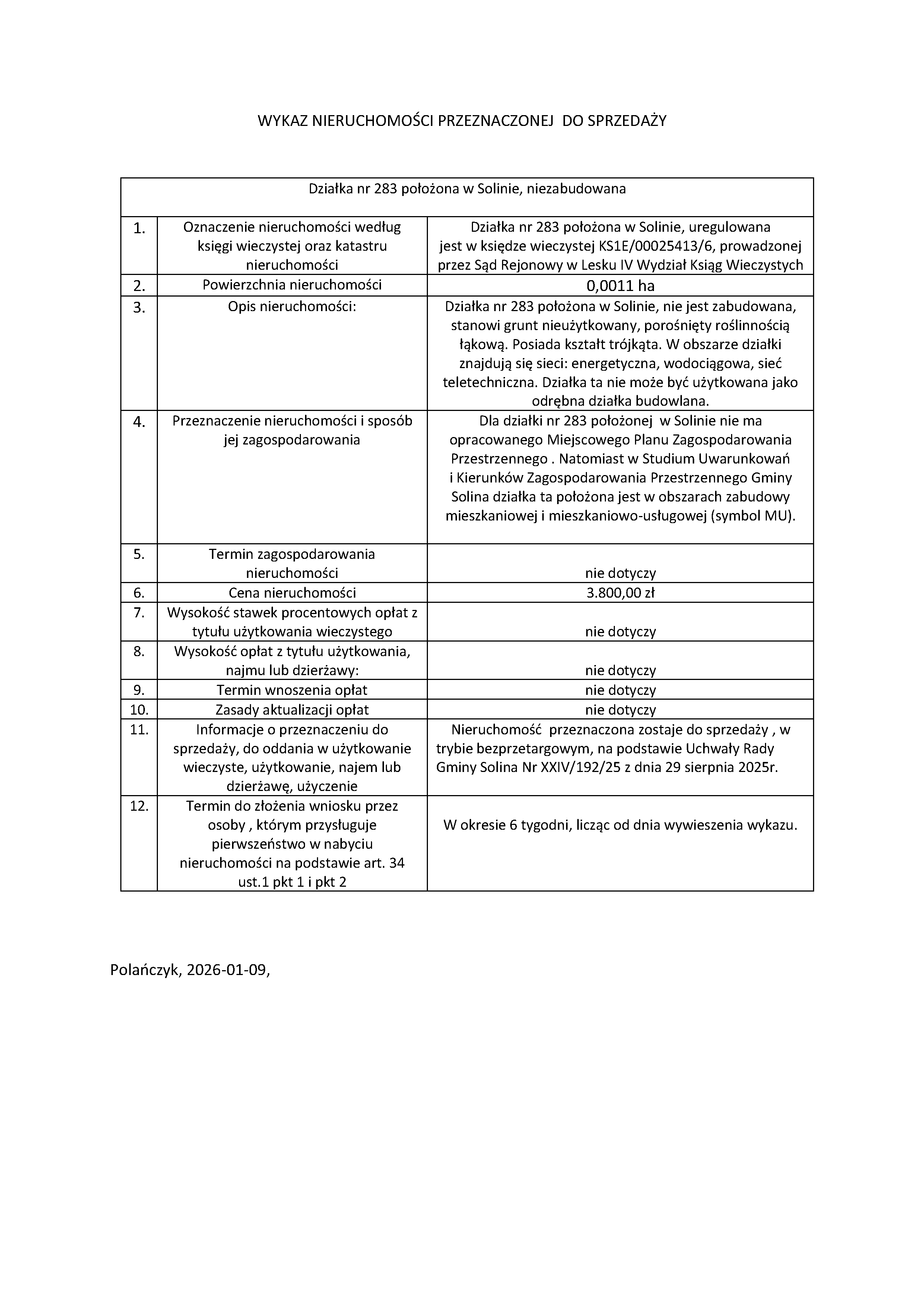 Wykaz nieruchomości przeznaczonej do sprzedaży