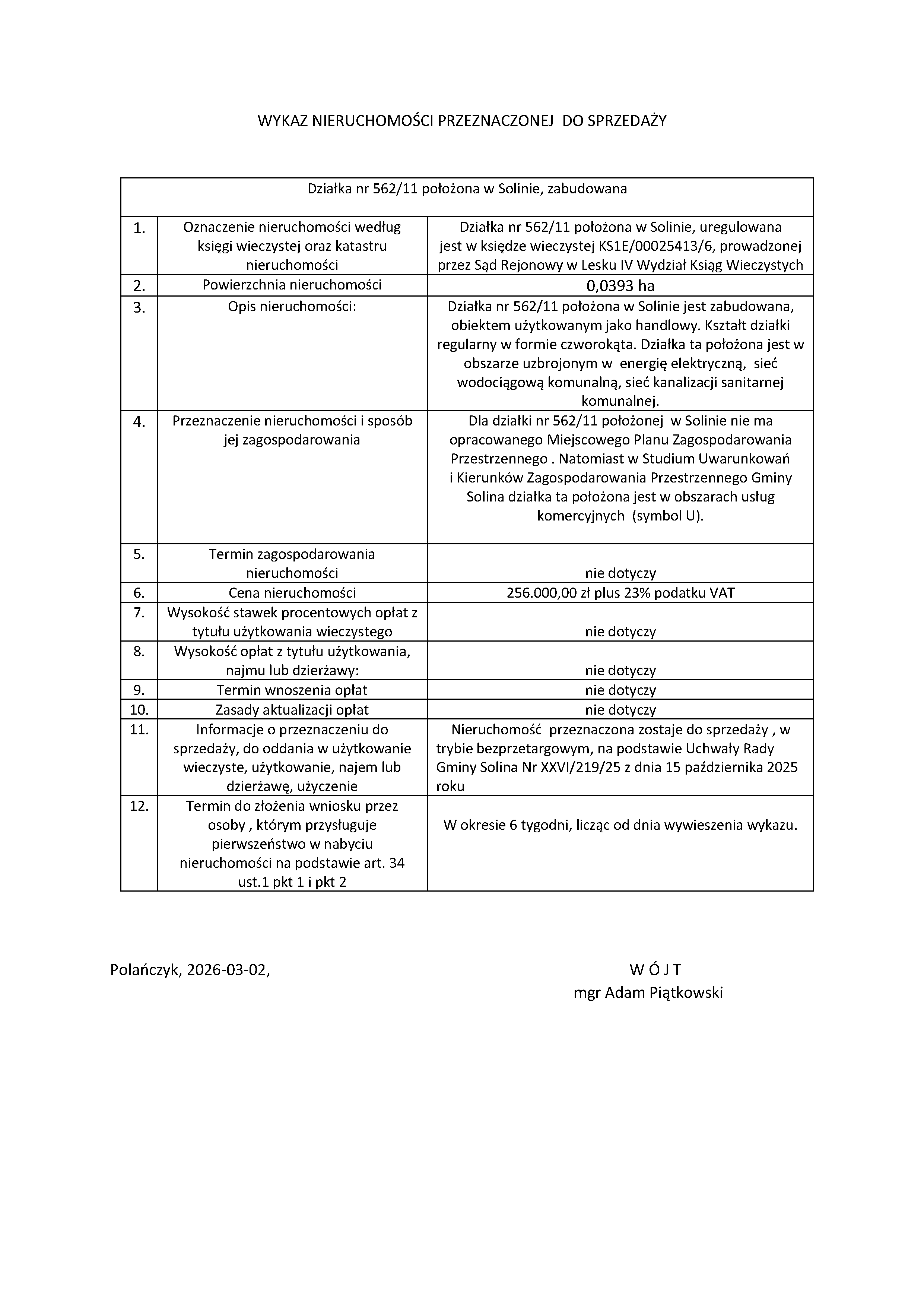 Wykaz nieruchomości przeznaczonej do sprzedaży
